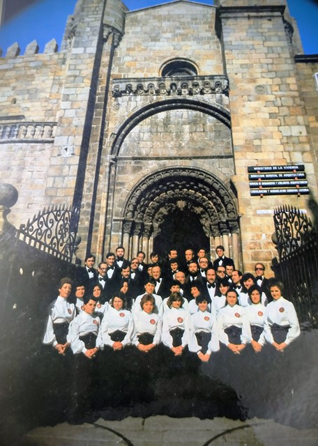 A foto que acompaña esta achega fíxose nunha das entradas laterais da Catedral de Ourense. Aquel lustro no que estivemos nesta prestixiosa coral (1978-1983), coincidiu coa mellor etapa do Orfeón como proxección, tanto en actuacións en Ourense cidade, outrosí na provincia e fóra dela. Mesmo apareceramos nun calendario de Caixa Ourense e tamén en varias postais. Salientar a actuación na Semana de Música Sacra de Cuenca. Tamén fixemos o propio en Guimarães, Coimbra (do que falaremos na seguinte achega), Villafranca do Bierzo, Vigo e outras cidades e vilas galegas abeiradas. Ademais do formato en vinilo, apareceran os dous discos en casetes que escoitabamos no magnetofón (ou no radio-casete do Citroën Dyane-6). Unha xeira leda e moi pracenteira. Beizón!