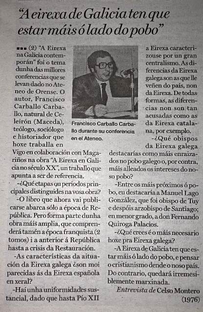 Recupera o xornal La Región, cincuenta anos despois, a entrevista que lle fixera o crego Celso Montero (xa na órbita do PSOE do que logo sería senador) ao presbítero Francisco Carballo (xa na órbita do nacionalismo galego), co gallo dunha charla no Ateneo de Ourense. Titulárana “A Eirexa de Galicia ten que estar máis ó lado do pobo”: